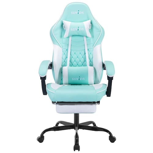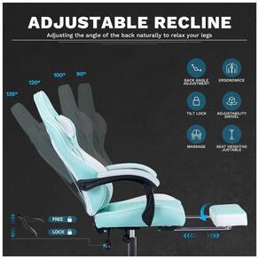 Os designers profissionais melhoraram as especificações das cadeiras de jogos tradicionais e mudaram a sensação de sentar com base na ergonomia. O assento tem de largura e foi projetado para ser mais espaçoso. Uma melhoria na superfície tradicional do assento em forma de U, os lados foram aparados para torná lo quase plano. Mesmo se você abrir as pernas, você não se sente contido e não sente dor quando se senta. Se você se sentar por longos períodos de tempo no trabalho ou no estudo, continuará se sentindo confortável, mesmo se mover as pernas. A profundidade do assento é de e a distância entre a parte de trás do joelho e o assento é muito próxima para apoiar as pernas. Projeto ergonômico O recurso do apoio de braço de ligação é que ele pode ser suportado em qualquer forma do corpo e ângulo. Apoie suavemente o braço enquanto olha para o telefone ou para os quadrinhos. Com a almofada grossa, você pode descansar o braço por longos períodos de tempo sem dor ou fadiga. Usando o elevador de gás Premium de alta qualidade certificado pela agência internacional de certificação SGS, a qualidade e a segurança são garantidas. Ajuste de altura livre e suave dentro da faixa de altura de . Ajuste facilmente de 90 a 135 com o encosto reclinado. Descansar bem, mesmo quando você não está na cama ou no chão, é ótimo para cochilos entre os empregos. Rico em funções O travesseiro lombar está equipado com um dispositivo de vibração USB, que pode ser conectado a qualquer dispositivo de fonte de alimentação USB, como um computador, console de jogos ou carregador de celular, etc., para fornecer energia facilmente e realizar a vibração da cintura. O apoio para os pés telescópico permite que você se sente com as pernas estendidas. Se você usá lo com o encosto reclinável, pode relaxar como se estivesse deitado em uma cama. Quando não está em uso, o apoio para os pés se esconde facilmente sob a cadeira para economizar espaço. Rodízios silenciosos feitos em resina, movem se suavemente e sem barulho. A base de nylon não enferruja, é durável e possui forte resistência à compressão. Suporta uma carga de 150 kg.