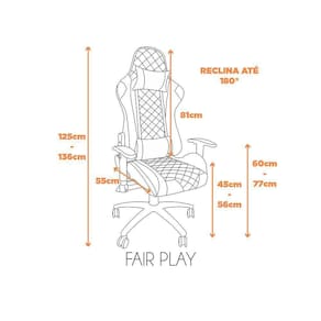A cadeira Gamer que você precisa! A Gamer Fair Play é toda em couro ecológico com sua base em aço. Ela possui o sistema relax e seu encosto inclina até 180 ficando totalmente deitada, o que torna ela ainda mais confortável. Além de possuir regulagem da altura do braço, para que se adeque a qualquer mesa que for encostada. Características: Encosto / Assento em Madeira e Espuma com Revestimento em Couro Ecológico (PU) e Base em Aço Acabamento Poliuretano (PU) Suporta Ate 120 Kg Pés Reguláveis / Rodizio Material Dos Pés: Aço Possui Rodízios: Com Rodas Altura Do Assento Ate o Chão: 45 cm Como Utilizar: Cuidados Com o Produto / Pano Úmido Matéria Prima: Madeira / Espuma Revestimento Do Assento: Poliuretano (PU) Tipo Encosto: Com Ajuste Reclinável Revestimento Do Encosto: Poliuretano (PU) Conteúdo Da Embalagem: Encosto Assento Almofada Apoio de Cabeça e Lombar Par de Braços Flange (Mecanismo) Pistão Capa Telescópica Rodizio (Estrela + Rodinhas) Kit de Parafusos + Chave de Parafusos Dimensões: Altura: 136 cm Largura: 55 cm Profundidade: 55 cm Largura do Assento: 55 cm Peso: 16,95 Garantia do Fornecedor: 12 mesesCor: Preto