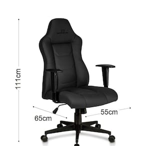 Cadeira giratória Gamer de espaldar alto com assento e encosto estruturado em madeira laminada e estofado com espuma laminada com densidade D28. Revestimento em sintético preto.