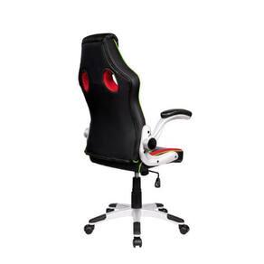 Assento com ajuste de altura, estofado e revestido em Couro Pu Preto com detalhes Vermelho e Verde;