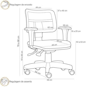 Descrição do produto: A Cadeira Executiva Giratória Zip é a opção ideal para compor o seu ambiente office. Máximo conforto com encosto e assento revestidos com espuma injetável, além de contar com o Mecanismo Evolution de duas alavancas com movimento de inclinação/contato permanente do encosto. A Cadeira Zip garante a ergonomia, conforto e saúde de acordo com a necessidade do usuário. Dimensões do produto (L x A x P) 58 x 78 a 88 x 54 cm Medidas internas: Profundidade assento: 48 cm Profundidade do braço: 26 cm Largura assento: 48 cm Largura de braço a braço: 62 cm Altura encosto: 37 a 46 cm Altura do chão ao assento: 42 a 53 cm Altura do braço ao chão: 60 a 66 cm Altura do assento ao encosto: 37 a 46 cm Altura do assento ao braço: 18 a 25 cm Características: Capas do assento e estrutural do encosto injetados em PP. Revestimento em Suede de qualidade; Madeira compensada no assento. Espuma do assento injetada em poliuretano flexível de alta densidade e alta resiliência. Possibilidade de estofamento do encosto a partir de tecido ou sintéticos e espumas flexíveis de poliuretano, tapeçado ou em tela flexível aberta, à base de poliéster. Mecanismo Evolution de duas alavancas com movimento de inclinação/contato permanente do encosto. Coluna a gás em conformidade DIN 4550, com curso de 120 mm para ajuste de altura do assento, com telescópio para proteção e acabamento. Base giratória piramidal em Nylon com fibra de vidro e diâmetro de 670 mm. Rodízio em Polipropileno. Braços com altura regulável estruturados em chapa de aço, com carenagem em polipropileno e apoio superior injetado e PU Skin. Peso Suportado: Até 120 kg. - Por se tratar de estofado as medidas podem ter uma pequena variação de até 3 cm. - A tonalidade do produto real poderá ter ligeira variação devido o lote de tecidos. Observações importantes: A montagem será de responsabilidade do comprador; Responsabilizamo-nos pela entrega em todo território nacional, até onde as rodovias alcançam, entregas fluviais ou aéreas devem ser cotadas a parte; As imagens são ilustrativas, não acompanham objetos de decoração e eletrônicos; Não nos responsabilizamos, no ato da entrega, por subir escadas/elevadores ou transporte por guincho em apartamentos. Eventuais despesas são de responsabilidade do comprador; Confira as dimensões do produto e certifique-se de que passará normalmente por supostos elevadores, portas, escadas e/ou corredores de sua residência; Altura Montado: 78 | Largura Montado: 58 | Profundidade Montado: 54