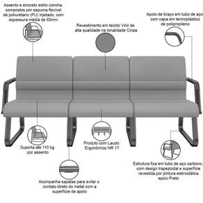 Com rodas: Não | Com apoio de braços: Sim | Material do estofamento: Vinil | Cor: Cinza | de registrocertificação INMETRO: ABNT NBR 13962, ABNT ABNT NM 300, NR 17 | Modelo detalhado: Lev Longarina 3 lugares Base Preta | Com aro para pés: Não | Requer montagem: Sim | Tipo de cadeira de escritório: Cadeira Longarina, Sala de Espera | Materiais do aro para pés: na | ProductLength: 66 cm | ColorSimple: Cinza | Model: Lev | ProductContents: 01 Longarina, manual de instruções | ColorSupplier: Cinza | ProductWidth: 198 cm | ProductInstructions: Produto para uso em ambiente interno, nao devendo ficar exposto ao sol, calor e umidade excessivos. | Material: Tubo de Aço Carbono, Espuma ível Poliuretano, Vinil | ProductWeight: 17 kg | SupplierSimpleName: Cadeira Longarina 3 Lugares Recepção com Braço Pés Preto Lev P03 Vinil Cinza - Lyam Decor | ColorFamily: Cinza | OriginState: PR | ProductWarranty: 90 dias após o do produto | MaterialFamily: Vinil | ProductHeight: 82 cm | OriginCountry: | Color: Cinza | SizeDescription: Altura: 82 cm x Largura: 198 cm x Profundidade: 66 cm | Modelo: Lev | Formato de venda: Unitário