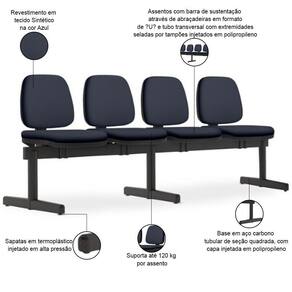 Material do estofamento: Espuma ível de Poliuretano injetado | ColorSupplier: PretoAzul | ProductWarranty: 90 dias após o do produto | Materiais do aro para pés: na | Color: Azul | ProductWidth: 250 cm | Material: Espuma ível de Poliuretano injetado, Tubo Aço Carbono, Polipropileno | ColorFamily: Azul | ProductLength: 68 cm | OriginCountry: | Tipo de cadeira de escritório: Longarina | ColorSimple: Azul | Com aro para pés: Não | Com rodas: Não | ProductWeight: 42 kg | Modelo detalhado: Work 4 Lugares | Requer montagem: Sim | SizeDescription: Altura: 88 cm x Largura: 250 cm x Profundidade: 68 cm | Model: Work | ProductHeight: 88 cm | ProductInstructions: Produto para uso em ambiente interno, nao devendo ficar exposto ao sol, calor e umidade excessivos. | ProductContents: 01 Longarina | Com apoio de braços: Não | Cor: PretoAzul | Modelo: Work | OriginState: PR | Formato de venda: Unitário | SupplierSimpleName: Cadeira Longarina 4 Lugares Recepção Sala de Espera Work F02 Sintético Azul - Lyam Decor