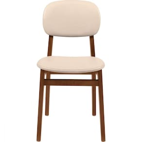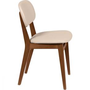 Informações Gerais : Cadeira sem braços de madeira tauarí. Acabamento com verniz tingido de amêndoa. Assento e encosto estofado em couríssimo bege. Produto é entregue montado.