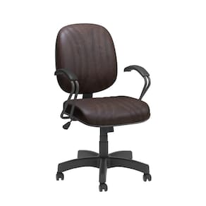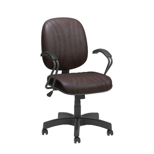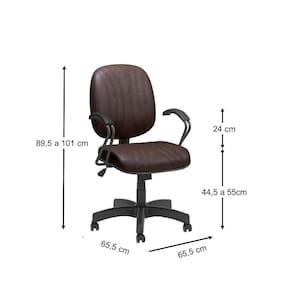 Base giratória com regulagem de altura com sistema a gás. Assento e encosto com espuma injetada e anatômica. Tapeçada em corano com costura. Com base preta.