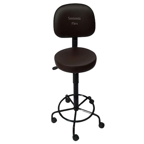 Cadeira mocho caixa alta com encosto secretaria - base de ferro e rodízio para recepção mercado balcão corano marrom Cadeira caixa - com regulagem de altura a gás - estrela com rodízios - prolongador de tamanho - madeira