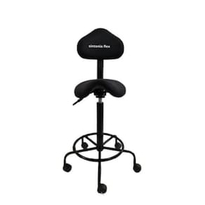 Cadeira sela - regulagem de altura a gás - espuma injetada , revestida em tecido suede - bordas em pvc flexivel - apoio para os pés - estrela de ferro - com rodízios.