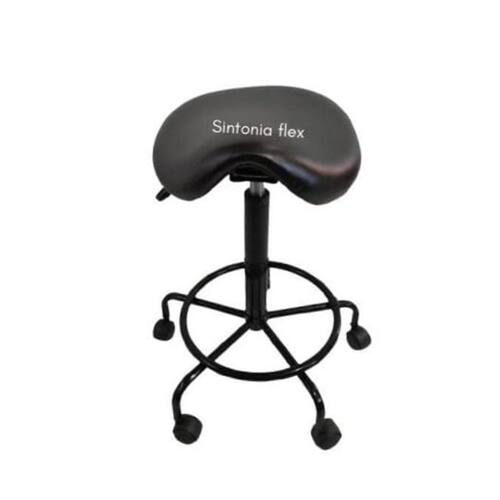 Cadeira sela - regulagem de altura a gás - espuma injetada , revestida em corano - bordas em pvc flexivel - apoio para os pés - pintura eletrostática - com rodízios - estrela de ferro - acabamento em PP