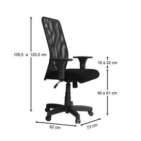 Base giratória preta com relax e regulagem de altura com sistema a gás. Encosto de Tela 100% Poliéster extra forte com resina anti-encolhimento. Assento com Espuma Injetada D-45, extra conforto com alta qualidade. Tapeçada com tecido espumado extra macio.