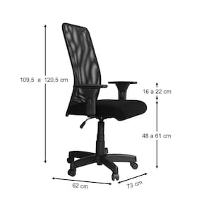 Base giratória preta, com regulagem de altura com sistema a gás. Encosto de Tela 100% Poliéster extra forte com resina anti-encolhimento. Assento com Espuma Injetada D-45, extra conforto com alta qualidade. Tapeçada com tecido espumado extra macio.