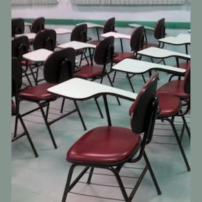 Cadeira Universitária do tipo Secretária, com estrutura metálica e prancheta em madeira.