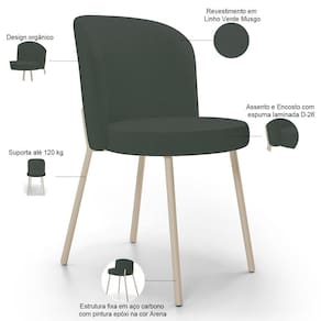 ProductContents: 01 Cadeira | Cor do estofamento: Verde | Largura da cadeira: 44 cm | Profundidade do assento: 42 cm | Espessura do assento: na | ColorSimple: Verde | Altura da cadeira: 80 cm | Altura do assento a partir do solo: 46 cm | OriginCountry: | Model: Gavi | ColorSupplier: Verde | ProductWarranty: 90 dias após o do produto | Largura do assento: 42 cm | Firmeza: Sim | SupplierSimpleName: Cadeira para Sala de Jantar Cozinha Estofada Gavi Arena L02 Linho Verde Musgo - Lyam Decor | ColorFamily: Verde | Material do estofamento: Madeira, Espuma, Linho | Cor do assento: Verde | ProductLength: 101 | ProductWeight: 5 kg | É empilhável: Não | ProductHeight: 43 | Desenho do tecido: Liso | SizeDescription: 43 x 44 x 101 cm | OriginState: PR | Fabricante: Lyam Decor | ProductWidth: 44 | Color: Verde | Material: Madeira, Espuma, Bouclê | É cadeira de balanço: Não | Peso máximo suportado: 120 kg | MaterialFamily: Madeira, Espuma, Bouclê | Cor da estrutura da cadeira: Arena | Requer montagem: Não | ProductInstructions: Produto para uso residencial em ambiente interno, não devendo ficar exposto diretamente ao sol, calo | Profundidade da cadeira: 53 cm | Tempo de montagem: na | Cor: Verde | É dobrável: Não