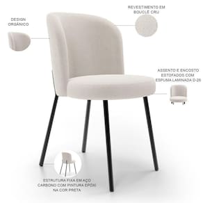 Altura da cadeira: 80 cm | Altura do assento a partir do solo: 46 cm | Color: Bege | ColorFamily: Bege | ColorSimple: Bege | ColorSupplier: Cru | Cor: CRU | Cor da estrutura da cadeira: Preto | Cor do assento: Cru | Cor do estofamento: Cru | Desenho do tecido: Bouclê | É cadeira de balanço: Não | É dobrável: Não | É empilhável: Não | Espessura do assento: na | Fabricante: Lyam Decor | Firmeza: Firme | Largura da cadeira: 44 cm | Largura do assento: 42 cm | Material: Tecido, Aço | Material do estofamento: Bouclê | MaterialFamily: Tecido, Aço | Model: Gavi | OriginCountry: | OriginState: PR | Peso máximo suportado: 120 kg | ProductContents: 01 Cadeira | ProductHeight: 80 cm | ProductInstructions: Produto para uso em ambiente interno, nao devendo ficar exposto ao sol, calor e umidade excessivos. | ProductLength: 53 cm | ProductWarranty: 90 dias após o do produto | ProductWeight: 5 kg | ProductWidth: 44 cm | Profundidade da cadeira: 53 cm | Profundidade do assento: 42 cm | Requer montagem: Não | SizeDescription: Altura: 80 cm x Largura: 44 cm x Profundidade: 53 cm | SupplierSimpleName: Cadeira Para Sala de Jantar Cozinha Estofada Gavi L02 Bouclê Cru - Lyam Decor | Tempo de montagem: na