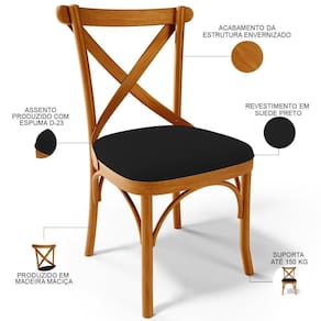 Inspirada no elegante mobiliário parisiense do século 19 e pensada para proporcionar máximo conforto, a Cadeira Ávila combina estilo e funcionalidade de uma maneira única. Estruturada em madeira maciça, possui detalhes curvilíneos que trazem suavidade e delicadeza a peça, seu acabamento envernizado a torna um mobiliário de destaque e trás durabilidade e confiança ao seu uso. Possui assento estofado, que proporciona ao seu usuário a sensação de comodidade ideal e ainda adiciona classe a qualquer ambiente. Seu design a torna uma peça versátil que abre portas a sua imaginação pois pode ser disposta em salas de jantar, estar, e espera, quartos, halls de entrada e cozinhas. Expresse seu bom gosto, e adquira já essa obra-prima da sofisticação! Dimensões do Produto (L x A x P) 49,5 x 86,5 x 55 cm Medidas Internas: Largura do assento: 44,5 cm Profundidade do assento: 43 cm Altura do encosto ao assento: 40 cm Largura total do encosto: 49,5 cm Altura do chão ao assento: 50 cm Largura do encosto: 38 cm Características: Estrutura em Madeira Maciça, com acabamento envernizado. Assento estofado com espuma D-23. Revestimento em Suede na cor Preto, de ótima qualidade. Peso suportado de até 150 kg. - Produto entregue montado. - Por se tratar de estofado as medidas podem ter uma pequena variação de até 3 cm. - A tonalidade do produto real poderá ter ligeira variação devido o lote de tecidos. - A limpeza deve ser feita com pano levemente umedecido em água limpa, sem esfregar, não utilizar produtos abrasivos, desengordurantes, álcool ou solvente. Observações importantes: - Produto para uso residencial em ambiente interno, não devendo ficar exposto diretamente ao sol, calor e umidade excessivos. - Pode haver alguma diferença de tonalidade entre a imagem e o produto real, por conta do tratamento de imagens e a calibração de cores do seu monitor. - As imagens são meramente ilustrativas, não acompanham objetos de decoração e eletrônicos. - Ao receber a mercadoria, o cliente deve verificar as condições da embalagem, caso haja alguma não assine o de . - Montagem, desmontagem e outras instalações serão de responsabilidade do cliente. Não nos responsabilizamos, no ato da , por subir escadas/elevadores ou pelo por guincho em apartamentos. Eventuais despesas são de responsabilidade do comprador. - Confira as dimensões do produto e certifique-se de que passará normalmente por supostos elevadores, portas, escadas e/ou corredores de sua residência. Color: Preto | ColorFamily: Preto | ColorSimple: Preto | ColorSupplier: Preto | Material: Madeira Maciça | MaterialFamily: Madeira | Model: Ávila | OriginCountry: | OriginState: PR | ProductContents: 01 Cadeira | ProductHeight: 86 cm | ProductInstructions: Produto para uso em ambiente interno, nao devendo ficar exposto ao sol, calor e umidade excessivos. | ProductLength: 55 cm | ProductWarranty: 90 dias após o do produto | ProductWeight: 8 kg | ProductWidth: 49 cm | SizeDescription: Altura: 86 cm Largura: 49 cm Profundidade: 55 cm | SupplierSimpleName: Cadeira Para Sala de Jantar e Estar Living Estofada Ávila L02 Suede Preto - Lyam