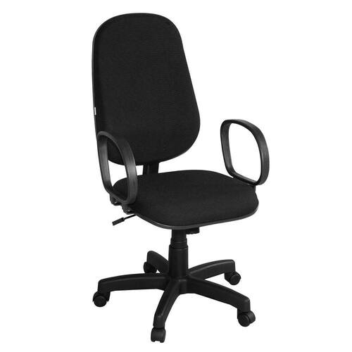 Base giratória com relax e regulagem de altura com sistema a gás. Assento e encosto injetado e anatômico e tapeçado em tecido J. Serrano. Base e Braço na cor preta.