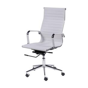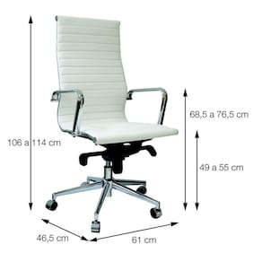 Material: Couro Ecológico, Metal e Nylon. Acabamento: Couro Ecológico Base e braços: Cromado Assento e encosto com mecanismo relax e travamento. Rodízio anti-risco Altura do assento até o chão: 49 à 55cm Dimensões (LxPxA): 61 x 48 x 106 à 114 cm Peso: 15 Kg Peso Máximo Suportado: 120 Kg