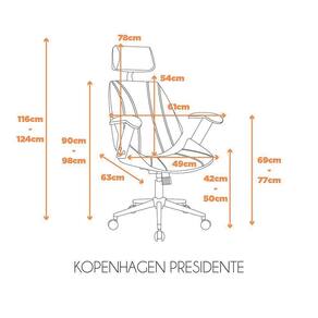 A cadeira Kopenhagen Presidente é toda revestida em couro ecológico e possui sua estrutura em madeira, o que a torna ótima por conta de seu design para salas de reuniões e presidência. Ela também possui o mecanismo relax, o que irá manter quem estiver sentado nela mais confortável, o que unido a seu encosto de cabeça é ainda mais confortável, além de ser possível ajustar a altura do assento. Característica: Estrutura em Madeira com Encosto Assento Revestido em Couro Ecológico (PU) com Base Cromada Acabamento: Couro Ecológico Suporta Ate 120 Kg Pés Reguláveis / Rodizio Material Dos Pés: Aço Possui Rodízios: Com Rodas Altura Do Assento Ate o Chão 42 cm Como Utilizar: Cuidados Com o Produto / Pano Úmido Matéria Prima: Madeira / Aço Revestimento Do Assento: Couro Ecológico Tipo Encosto: Sem Ajuste Reclinável Revestimento Do Encosto: Couro Ecológico