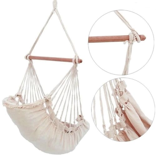 Cadeira suspensa que pode ser instalada em diversos locais como sacadas, varandas, parques, acampamentos, em casa, quintal, etc. Pode ser pendurada em vigas, lajes, árvores, telhados ou em qualquer lugar que tenha altura e suporte o peso recomendado.Perfeita para decorar ambientes e para descansar com conforto.Fácil de instalar: basta retirar da embalagem, inserir a madeira na parte do assento e cordas de sustentação. É só pendurar onde desejar.Planejada para ser utilizada por pessoas de qualquer altura com conforto.Se o local de instalação for muito alto, pode-se utilizar corda, corrente ou qualquer extensor para que fique na altura ideal.Acompanha:* Madeira de sustentação* Corda (punhos) de sustentação* Assento e apoio para as costasEspecificações:-Madeira de alta resistência com 95 cm de largura-Suporta até 90 kg-De fácil montagem e instalação-Tecido feito com 100% Algodão-Fácil de lavar, pode ser à mão ou em máquinas-Peso do produto: +/- 1,900 kg incluindo a madeira-Altura mínima entre o piso e o local a ser instalada recomendada é de 2,00 m.