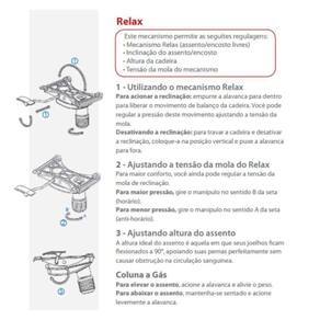 Mecanismo e Base: Relax giratório com trava na posição de operação, sistema de ajuste de tensão do relax e mecanismo a gás para subida e descida do sistema, aranha preta e rodízios de duplo giro de nylon. Pistão pneumático com acabamento de telescópio preto.