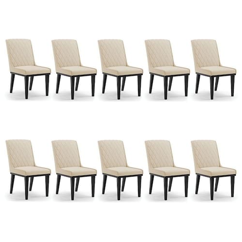 A Cadeira Sofia, é a opção ideal para quem quer um ambiente moderno e sofisticado! Um móvel super compacto, que se adequa perfeitamente em diversos ambientes. É uma ótima escolha para área de descanso, sala de estar, hall de entrada, espaço gourmet, varanda, recepção, escritório ou até mesmo para compor a mesa de jantar. Demais, né? Possui um design elegante, clássico e super convidativo, sem dúvidas ela dará um toque todo especial ao espaço que for posicionada. Feita em madeira maciça de eucalipto reflorestado, possui também base fixa em tom preto o que garante mais segurança, ótima sustentação e durabilidade à peça. O detalhe principal desta linda cadeira , fica por conta da alta-costura no encosto, em estilo matelassê. Um método aplicado no tecido de aparência acolchoada, o que confere um acabamento mais refinado à peça. Além do mais, os desenhos geométricos do tecido adicionam um toque luxuoso ao produto. Seu estofamento é feito com espuma D-23, revestida no Suede, o que garante maciez e conforto, trazendo aquela sensação de abraço e suavidade ao sentar-se. E o que falar da cor Bege dessa cadeira ? Um tom extremamente elegante e versátil, perfeito para harmonizar com diferentes estilos de decoração. Afinal, não há nada melhor do que relaxar em uma Cadeira aconchegante, para ler um bom livro, ou assistir aquela série preferida, com o máximo de conforto possível, não é mesmo? Você irá se surpreender com o conforto da Cadeira Sofia. Aqui na D'Rossi, você encontra o que há de melhor em produtos, para você e sua família. Leve seu Kit 10 cadeiras Sofia e arrase!