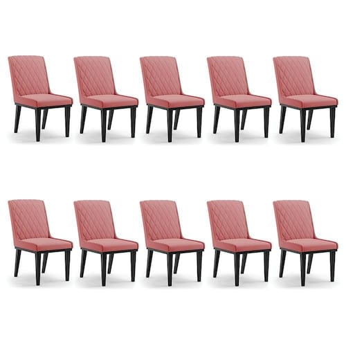 A Cadeira Sofia, é a opção ideal para quem quer um ambiente moderno e sofisticado! Um móvel super compacto, que se adequa perfeitamente em diversos ambientes. É uma ótima escolha para área de descanso, sala de estar, hall de entrada, espaço gourmet, varanda, recepção, escritório ou até mesmo para compor a mesa de jantar. Demais, né? Possui um design elegante, clássico e super convidativo, sem dúvidas ela dará um toque todo especial ao espaço que for posicionada. Feita em madeira maciça de eucalipto reflorestado, possui também base fixa em tom preto o que garante mais segurança, ótima sustentação e durabilidade à peça. O detalhe principal desta linda cadeira , fica por conta da alta-costura no encosto, em estilo matelassê. Um método aplicado no tecido de aparência acolchoada, o que confere um acabamento mais refinado à peça. Além do mais, os desenhos geométricos do tecido adicionam um toque luxuoso ao produto. Seu estofamento é feito com espuma D-23, revestida no Suede, o que garante maciez e conforto, trazendo aquela sensação de abraço e suavidade ao sentar-se. E o que falar da cor Rosê dessa cadeira ? Um tom extremamente elegante e versátil, perfeito para harmonizar com diferentes estilos de decoração. Afinal, não há nada melhor do que relaxar em uma Cadeira aconchegante, para ler um bom livro, ou assistir aquela série preferida, com o máximo de conforto possível, não é mesmo? Você irá se surpreender com o conforto da Cadeira Sofia. Aqui na D'Rossi, você encontra o que há de melhor em produtos, para você e sua família. Leve seu Kit 10 cadeiras Sofia e arrase!
