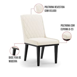 A Cadeira Sofia, é a opção ideal para quem quer um ambiente moderno e sofisticado! Um móvel super compacto, que se adequa perfeitamente em diversos ambientes. É uma ótima escolha para área de descanso, sala de estar, hall de entrada, espaço gourmet, varanda, recepção, escritório ou até mesmo para compor a mesa de jantar. Demais, né? Possui um design elegante, clássico e super convidativo, sem dúvidas ela dará um toque todo especial ao espaço que for posicionada. Feita em madeira maciça de eucalipto reflorestado, possui também base fixa em tom preto o que garante mais segurança, ótima sustentação e durabilidade à peça. O detalhe principal desta linda cadeira , fica por conta da alta-costura no encosto, em estilo matelassê. Um método aplicado no tecido de aparência acolchoada, o que confere um acabamento mais refinado à peça. Além do mais, os desenhos geométricos do tecido adicionam um toque luxuoso ao produto. Seu estofamento é feito com espuma D-23, revestida no Veludo, o que garante maciez e conforto, trazendo aquela sensação de abraço e suavidade ao sentar-se. E o que falar da cor Bege dessa cadeira ? Um tom extremamente elegante e versátil, perfeito para harmonizar com diferentes estilos de decoração. Afinal, não há nada melhor do que relaxar em uma Cadeira aconchegante, para ler um bom livro, ou assistir aquela série preferida, com o máximo de conforto possível, não é mesmo? Você irá se surpreender com o conforto da Cadeira Sofia. Aqui na D'Rossi, você encontra o que há de melhor em produtos, para você e sua família. Leve seu Kit 10 cadeiras Sofia e arrase!