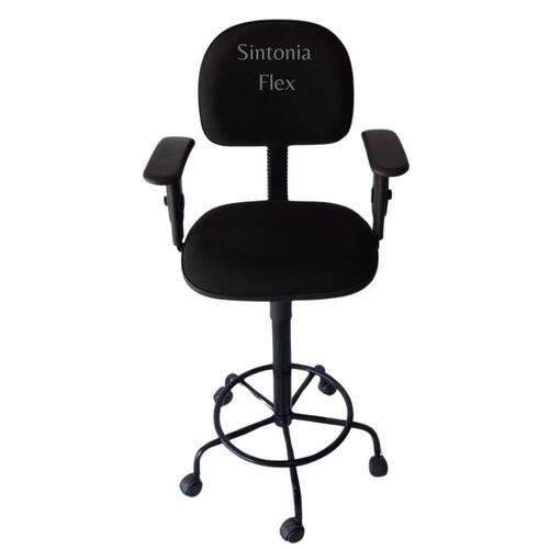 Cadeira secretaria caixa alta - braço com regulagem de altura com rodízio pra balcão recepção - tecido preta Cadeira caixa - aro para apoio dos pés - prolongador de altura - madeira reflorestada - espuma injetada - bordas em pvc flexivel - pés com rodízio Altura do chão ao assento: Mínima 63 cm Máximo 75 cm Marca: Sintonia Flex Ean: 7895103601765