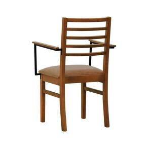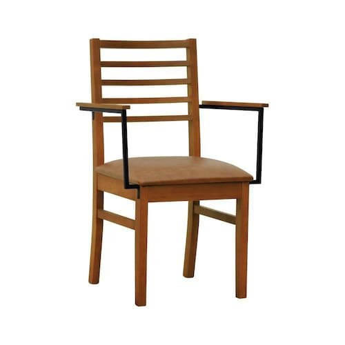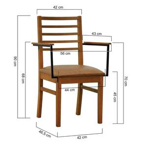 - Materiais: Estrutura em madeira de eucalipto maciço, assento estofado e encosto ripado, braços em aço de carbono com pintura epóxi e madeira tingida na cor amêndoa.