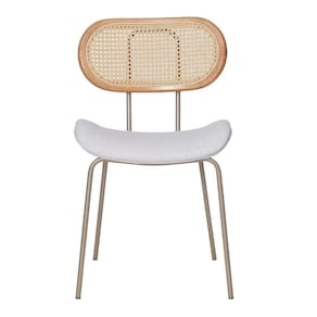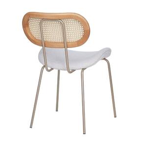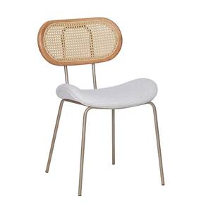 Nossa Cadeira Toscana Base Champagne - Nude Tecido combina um design moderno com um toque de charme vintage. O assento possui um formato ergonômico e é revestido em PU claro e suave, sugerindo conforto e um toque de sofisticação discreta. O encosto oval apresenta uma estrutura em madeira clara que emoldura um detalhe em telinha rattan trançado, adicionando uma textura natural e um apelo visual único à peça.