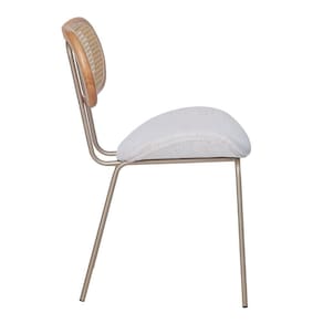 A cadeira é sustentada por quatro pernas finas de metal em champagne, que proporcionam um contraste elegante com o tecido e a madeira, além de conferir leveza visual à estrutura. A combinação de materiais o tecido macio, a madeira natural e o metal delicado cria um equilíbrio estético interessante, tornando esta cadeira uma adição estilosa e confortável a diversos ambientes. É uma peça que certamente atrairá olhares e proporcionará momentos agradáveis.