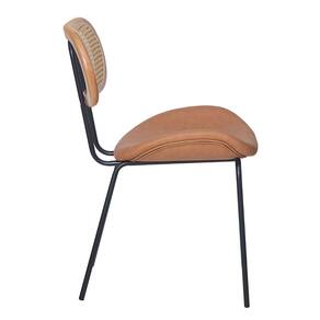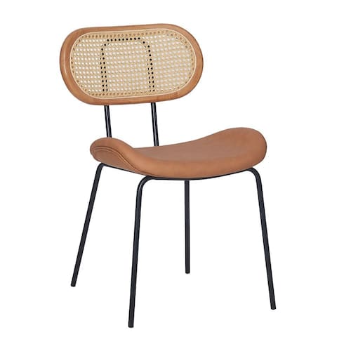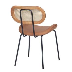 A cadeira é sustentada por quatro pernas finas de metal preto, que proporcionam um contraste elegante com o assento e a madeira, além de conferir leveza visual à estrutura. A combinação de materiais – o toque acolhedor do assento, a beleza natural do rattan e a estrutura metálica – cria um equilíbrio estético interessante, tornando esta cadeira uma adição estilosa e confortável a diversos ambientes. É uma peça que certamente atrairá olhares e proporcionará momentos agradáveis.
