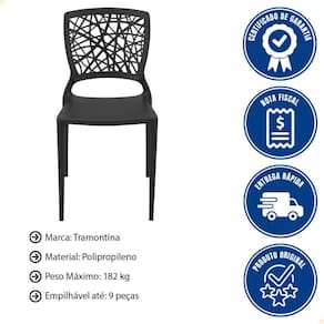 - A composição da sua sala de jantar ficará ainda mais encantadora, com a Cadeira Tramontina Joana em Polipropileno e Fibra de Vidro preta.