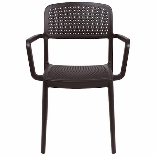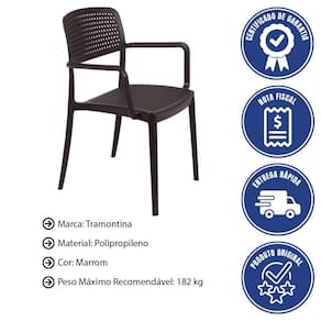 - A Cadeira Tramontina Serena em polipropileno marrom com braços une estilo e resistência em um só produto.
