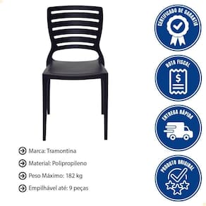 A cadeira possui 1 ano de garantia (90 dias legais + 9 meses contratuais) contra vícios ou de fabricação. cor: preto | EmbalagemLargura-cm: 48 | Marca: Tramontina | Modelo: Sofia | ProdutoAltura-cm: 82.5 | Altura Produto: 82.5 | ProdutoLargura-cm: 43.5 | EmbalagemAltura-cm: 86 | Dias Fornecedor: 1 | Cubagem: 0.231168 | EmbalagemComprimento-cm: 56 | Largura Produto: 43.5 | Peso Líquido: 0.0000