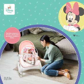 Com design encantador inspirado no Mickey e na Minnie, a cadeira possui barra de brinquedos removivel com dois acessorios interativos um chocalho que estimula o desenvolvimento auditivo, visual e motor, e um brinquedo de pano sensorial que desperta a curiosidade e a coordenacao do bebe.