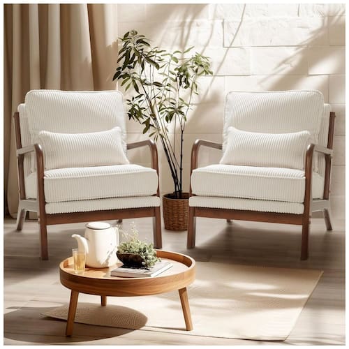 O conjunto FLEXISPOT AC1 é composto por duas cadeiras decorativas com assento e encosto estofados em tecido tipo veludo cotelê, indicado para salas de estar, quartos, escritórios domésticos e varandas cobertas. O design de linhas retas, braços curvos em madeira e encosto espesso remete ao estilo mid-century modern, integrando-se a ambientes contemporâneos e farmhouse sem interferir na circulação.