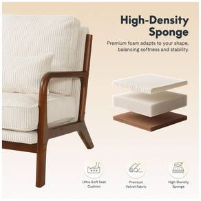 Cada poltrona utiliza espuma de alta densidade no assento e encosto, combinada com uma almofada lombar adicional, para fornecer suporte à região das costas em uso prolongado para leitura, trabalho ou descanso. O revestimento em tecido cotelê apresenta textura em listras discretas, toque macio e aparência uniforme, contribuindo para conforto térmico e resistência ao uso diário.