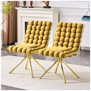 O conjunto TesNus reúne duas cadeiras de jantar giratórias estofadas em veludo mostarda, com assento e encosto em módulos acolchoados tipo bubble, sem braços, indicadas para salas de jantar, cozinhas, salas de estar e áreas de maquiagem. Cada cadeira utiliza base giratória de 360° com estrutura metálica em acabamento dourado e ponteiras antiderrapantes, mantendo o assento estável, sem rodas, para uso interno em superfícies rígidas.
