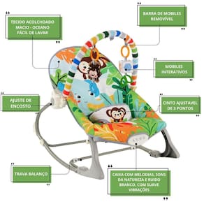 Principais características: - peso recomendado: até 18kgs - idade recomendada de 0 a 12meses - modo balanço até 7kg - modo cadeira até 18kg - cinto de segurança de 3 pontos - alça removível com 2 mobiles - caixa vibratória e musical com sons da natureza, ruido branco, e melodias suaves que acalmam o bebê. Necessários 3 pilhas aa não inclusas - ajuste para função balanço ou deitado com trava - acolchoado fofo e tecido removível para limpeza
