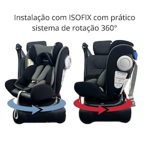Grupo 0/1/2/3 Instalação com ISOFIX com prático sistema de rotação 360, ajustável com uma mão. Instalação com o cinto de segurança de 5 pontos do veículo Instalação contra o movimento para uso desde o nascimento até 13Kg Instalação a favor do movimento para uso a partir de 9kg até 36kg Contra o movimento a posição de reclino é de bebê conforto indicado pela letra R na base da cadeira 3 posições de reclino na instalação a favor do movimento Há almofadas ajustáveis para o uso nos grupos 0 e 1 para maior conforto e segurança do bebê Possui uma proteção extra contra impacto lateral. 10 posições de ajustes de altura fazendo com que a cadeira cresça junto com a criança Tecidos e espuma sofisticadas e suaves ao toque Tecido respirável Botões de ajustes em cores contrastantes para facilitar a visualização. Cinto de segurança de 5 pontos para usos nos grupos 0 e 1.