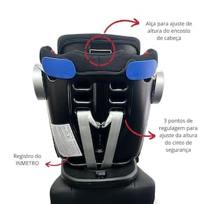 Grupo 0/1/2/3 Instalação com ISOFIX com prático sistema de rotação 360, ajustável com uma mão. Instalação com o cinto de segurança de 5 pontos do veículo Instalação contra o movimento para uso desde o nascimento até 13Kg Instalação a favor do movimento para uso a partir de 9kg até 36kg Contra o movimento a posição de reclino é de bebê conforto indicado pela letra R na base da cadeira 3 posições de reclino na instalação a favor do movimento Há almofadas ajustáveis para o uso nos grupos 0 e 1 para maior conforto e segurança do bebê Possui uma proteção extra contra impacto lateral. 10 posições de ajustes de altura fazendo com que a cadeira cresça junto com a criança Tecidos e espuma sofisticadas e suaves ao toque Tecido respirável Botões de ajustes em cores contrastantes para facilitar a visualização. Cinto de segurança de 5 pontos para usos nos grupos 0 e 1.