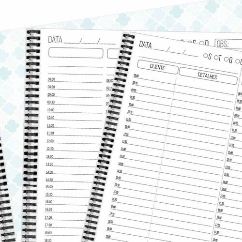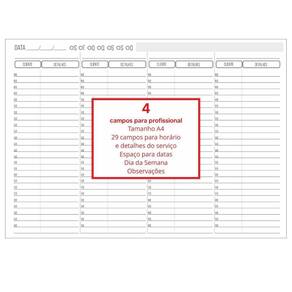 Tamanho a4 -4 campos para profissional- Campos para horário Espaço para: datas / dia da semana / observações Encadernação espiral Capa 250g + pvc transparente para proteção 150 páginas diárias. duração média 6 meses - 75 fls