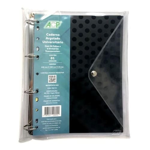 O Caderno Argolado Universitário 96F Poá Cristal Preto ACP é leve e bastante funcional. - Ideal para o dia a dia na escola ou na faculdade;- Caderno com ferragem 4 argolas;- Capa plástica com fechamento em botão de metal para maior proteção;- Segunda capa e contra-capa em poá cristal rosa;- 6 Divisórias transparentes;- 96 folhas pautadas. ESPECIFICAÇÕESMarca: ACPFormato: 240 x 300 mmNúmero de folhas: 96 folhasCapa/contracapa: Plástico e PVCFolhas Internas: Papel Offset 56 g/m