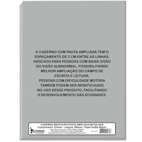 O caderno com pauta ampliada tem o espaçamento de 2 cm entre as linhas, indicado para pessoas com baixa visão ou visão subnormal, possibilitando melhor ampliação do campo de escrita e leitura. Pessoas com dificuldade motora também podem ser beneficiadas no uso desse produto, facilitando o desenvolvimento das atividades.