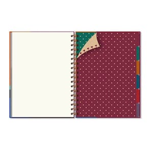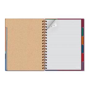 Capa dura, miolo pautado com 80 folhas removíveis e reposicionáveis, formato 16,5 cm x 23,2 cm, em papel offset 90 g/m2 (a tinta das canetas não passa para o outro lado), 6 divisórias removíveis e reposicionáveis coloridas em papel kraft, encadernação wire-o e elástico para fechamento. Acompanha envelope resistente para documentos e folha de adesivos.