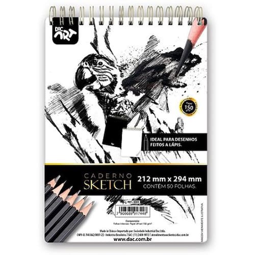 Caderno Sketchbook para Desenho da DAC - Ideal para artistas amadores ou profissionais, que amam desenhar a lapis! Com folhas grossas de 150g, ele garante que seus desenhos fiquem perfeitos, sem marcacoes no verso. A capa dura cartonada proporciona durabilidade e protecao, enquanto o sistema Wire-o facilita o manuseio, permitindo que voce desenhe com conforto em qualquer pagina.