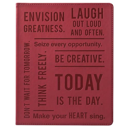 Caderno de diário grande forrado Eccolo, capa flexível, diário de escrever, 256 páginas pautadas em marfim, marcador de fita, plano, tamanho de mesa para trabalho ou escola, hoje é o dia (cor de vinho, 8 x 10 polegadas) — O caderno grande para mulheres e homens da Eccolo é a versão moderna e divertida do caderno clássico. Chique e colorido, este notebook profissional tem tudo o que você precisa para ser seu companheiro diário. Tamanho da mesa de escritório, capa flexível, estilo e praticidade — O diário forrado Eccolo costurado pela Smyth apresenta 256 páginas de papel 80GSM sem ácido marfim. A alta compatibilidade de tinta do papel perfeitamente texturizado ajuda a evitar vazamentos, desbotamento ou fantasmas ao escrever com a maioria das canetas, lápis ou marcadores. Com um design plano, as capas estéticas e vibrantes do caderno flexível o tornam o diário dos sonhos para escrever. Ideal para usuários destros e canhotos. Registrar no diário, fazer anotações e planejar nunca foi tão conveniente. O caderno para todos - O diário 8 por 10 apresenta uma variedade de combinações coloridas, pastéis e vibrantes, diferentes texturas e materiais premium e citações inspiradoras que o animarão e ajudarão na autorreflexão e na produtividade. Seus cantos arredondados e capa dura resistente fazem deste lindo diário um ótimo companheiro para a vida cotidiana. Confortáveis de segurar e transportar, basta colocá-lo em uma bolsa ou mochila e pronto - esses cadernos versáteis e bonitos são ideais para seu material de escritório ou material escolar. Adequado como diário, diário com marcadores, caderno escolar ou agenda, o caderno de capa flexível é a ferramenta certa para aumentar a produtividade do escritório