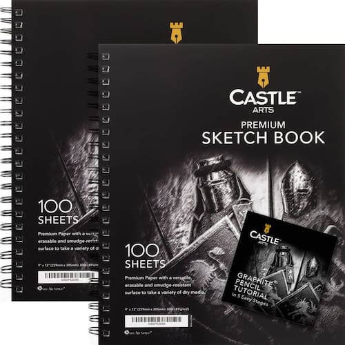 Castle Art Supplies Cadernos de esboço premium 23 x 30 cm | Pacote de bloco de desenho duplo | 200 folhas de papel de qualidade 90gsm | para artistas e alunos adultos | encadernado em espiral para - Feito para facilitar com 100 folhas fortes e lisas por bloco de esboço, leves para carregar onde sua busca criativa levar; encadernado em espiral em capas robustas para virar rapidamente; cada folha perfurada para remover para exibição ou referência. - Qualidade que dura resistente a manchas, não desbota, papel cartucho de 90 g/m², sem ácido para combater o amarelamento, permite que você não apenas capte, mas preserve ideias, observações e experiências conforme você se move pela vida e pelo mundo. - Uma alegria de usar. Experimente o prazer de desenhar quando ou onde quiser em papel texturizado para "segurar" mídia seca, dando a você liberdade para experimentar lápis de grafite, carvão, pastéis, lápis de cor ou canetas de gel. - TUTORIAL PARA CONSTRUIR SUAS HABILIDADES Este simples auxílio de aprendizagem se desdobra em 5 etapas para revelar o know-how para desenhar os impressionantes cavaleiros na capa e aplicar as lições ao seu próprio trabalho. - TESTADO, CONFIÁVEL E GARANTIDO Testado por nossos especialistas em estúdio para vencer os concorrentes. Confiado pelos melhores juízes - 2,5 milhões de clientes em todo o mundo. Apoiado por uma garantia exclusiva de devolução do dinheiro Plus.