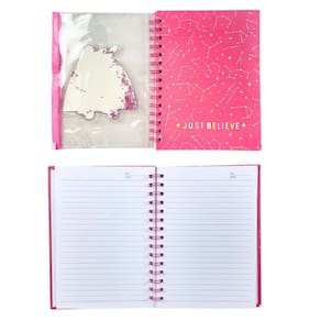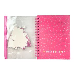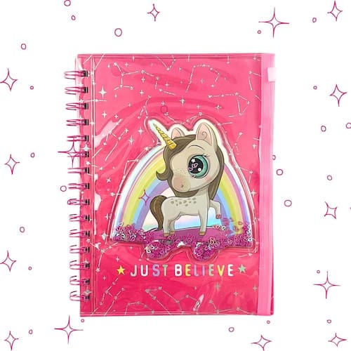 A Caderneta Decorada Unicórnio é cheia de estilo. Possui um bolso para guardar papéis, capa dura, espiral colorida e folhas pautadas brancas.