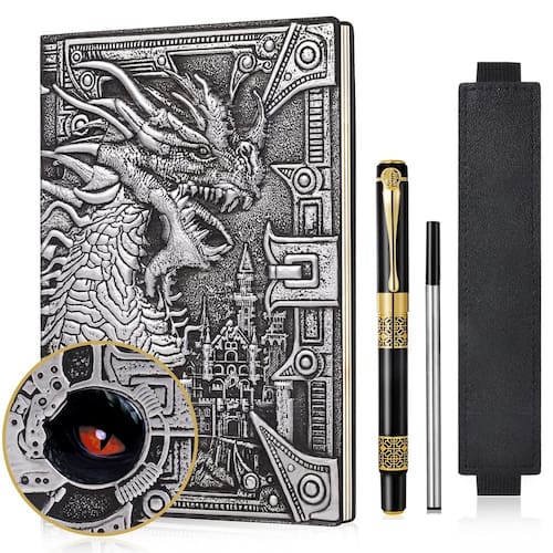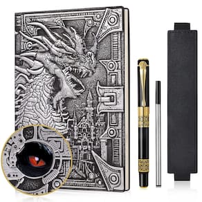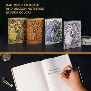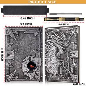 Descrição: Diário de couro tamanho A5: diário de couro de capa dura em relevo 3D tamanho A5 portátil (21,3 cm x 14,5 cm x 1,7 cm), fácil de transportar. Caderno legal de couro em relevo 3D, temos 4 cores deste diário de viagem para você escolher, capa dura de couro sintético de alta qualidade e artesanal. O pacote inclui: 1 diário de couro em relevo 3D, 1 caneta esferográfica vintage, 1 x refil de tinta preta extra. - ??Diário de couro em relevo de dragão 3D? Conjunto de caderno de couro vintage de dragão incluído: 1 diário de couro PU, 1 caneta esferográfica, 1 x refil extra para caneta esferográfica, 1 x capa elástica ajustável. Traga mais diversão para os jogadores de masmorras e dragões. - ??Design exclusivo? O diário de dragão vintage é feito de capa dura de couro PU, e o diário de viagem na parte traseira e na frente é totalmente feito à mão em relevo 3D exclusivo, o dragão na frente com visão 3D como no mundo da fantasia, e o olho profundo na parte de trás é feito de material de resina são muito realistas, então não se preocupe em ficar embaçado devido ao desgaste, e todos ficarão atraídos por esta fantasia. caderno de escrita. - ??Papel premium?- Este diário sobrenatural de dragão com 100 g/m² 100 folhas/200 páginas de papel grosso, colocado plano a 180°, experiência de escrita suave e sem sangramento de tinta. E este diário de viagem com dois tipos de papel, um é o papel pautado branco comum, outro é o papel pautado vintage, com este diário de couro de fantasia você pode desfrutar de diferentes experiências de escrita. - ??Vários usos? Este diário de viagem de couro vem com um conjunto de caneta esferográfica vintage, a caneta elegante e o caderno de escrita de fantasia com a experiência de escrita suave e são a combinação perfeita de presente de diário, você pode usá-lo para fazer registros de reuniões, registros de pensamentos de viagens, criação de poesia, planejador de metas, planejador semanal etc. - ??Presente perfeito? - Este caderno vintage de couro de dragão é um ótimo presente para quem é fã de DND ou para quem ama os livros de fantasia, e também pode ser um presente de aniversário para estudantes, professores e amigos.